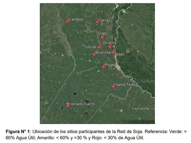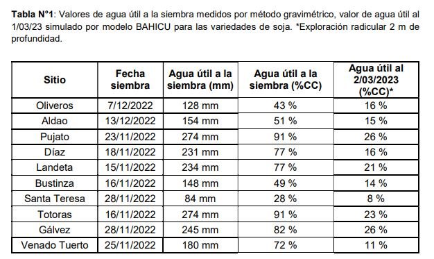 Dado que este modelo contempla la exploración radicular, la evolución del estado hídrico de la soja no dependerá exclusivamente de las lluvias, sino también del agua almacenada en el suelo que es captada durante la exploración radicular. Ahí radica la importancia del muestreo de agua útil, que es saber con cuánta agua partimos para nuestra producción. Para los distintos sitios que participan en la Red (Tablas 1; Figura 1), se puede observar los mm de agua disponible a la siembra, cuanto representan los mismos en porcentaje de capacidad de campo (CC) y el valor de agua útil disponible al 2-03-2023. Las escasas precipitaciones en la región y el consumo de agua por parte de los cultivos explican la baja disponibilidad de agua a la fecha, todos los sitios tienen valores de agua por debajo del límite de estrés (50% CC), condición que reviste de gran importancia ya que algunas variedades están atravesando su periodo crítico.