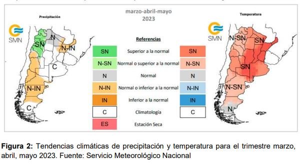 A este escenario hídrico crítico hay que sumarle el efecto de las altas temperaturas sobre el cultivo, desde noviembre hasta la fecha se registraron temperaturas máximas medias mayores a lo normal y se registraron 9 olas de calor, esta 9na ola de calor que estamos transitando se espera que continúe durante los próximos días. Según el informe emitido por SMN el día 28 de febrero estas condiciones de temperaturas mayores a lo normal para el sur de Santa Fe se mantendrán para el trimestre marzo, abril y mayo. En tanto las precipitaciones, para este trimestre se presentan en la categoría climatología, lo que implica que la categoría inferior, normal o superior tienen la misma probabilidad de ocurrencia (Figura 2), por lo tanto se recomienda actualizar y consultar los pronósticos emitidos por SMN e INTA.