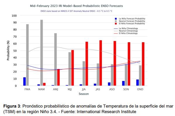 En tanto estado actual del Fenómeno del Niño Oscilación Sur (ENOS) para este trimestre (marzo, abril, mayo) hay un 94% de probabilidades de fase neutral, esta fase se mantendría durante otoño y principio de invierno (Figura 3).