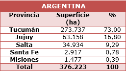 El Laboratorio de Sistemas de Información Territorial del INTA Famaillá elaboró el mapa de superficie plantada con caña de azúcar para la República Argentina, a partir de datos adquiridos por sensores remotos montados en plataformas satelitales. El procesamiento de las imágenes satelitales permitió establecer un total de 376.223 ha. cubiertas con caña en todo el país durante el año 2018, que serán destinadas a 23 ingenios que elaboran azúcar, alcohol y mezclas con naftas. Tucumán, con 273.737 ha. equivalentes al 73% del total plantado, ocupa el primer lugar. Le siguen Jujuy con 63.158 ha (16,8%), Salta con 34.934 ha (9,29%), Santa Fe con 2.917 ha (0,78%) y Misiones con 1.477 ha (0,39%).