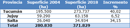 Al comparar los datos del 2018 con los resultados del trabajo “Relevamiento de cultivo de caña de azúcar en el noroeste argentino a partir de sensores remotos-INTA-Pro.Re.NOA” del año 2004, donde la superficie plantada era de 280.830 ha, observamos que el incremente fue superior al 24%.