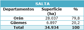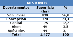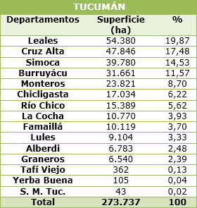 En los cuadros 3, 4, 5, 6 y 7 se muestran los resultados por provincias y departamentos de la República Argentina en cuanto a superficie ocupada por el cultivo.