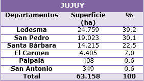 En este sentido, el crecimiento del área implantada en la provincia de Salta se hizo sobre la ocupación de áreas cultivadas con hortalizas, citrus y banana, especialmente en el departamento Orán; mientras, en Jujuy fue sobre áreas con granos y tabaco en los departamentos El Carmen, Palpalá y San Antonio; y en Tucumán fue sobre áreas ocupadas con granos en los departamentos Burruyácu, Cruz Alta y Leales, principalmente. En Santa Fe, por la incertidumbre sobre la situación de los 2 ingenios existentes, se produjo una retracción a menos de la mitad de su área tradicional, que fluctuaba históricamente entre 6.500 y 8.500 ha.