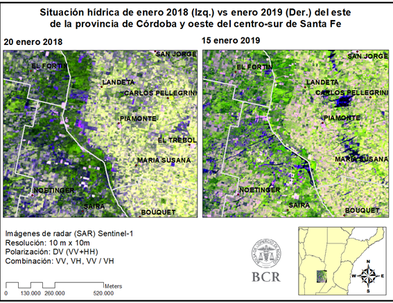 En el centro sur de Santa Fe, en la imagen de radar 15 de enero de este año (Sentinel-1), el agua en tonos azul oscuro mostraba cómo se expandía a gran escala los anegamientos. Tras las nuevas descargas, Maria Susana, Carlos Pellegrini, Bouquet y los campos del este están en condiciones muy complejas. Ya se prevén pérdidas graves de área cultivada. En el norte bonaerense, como en Pergamino, la gran amenaza es la napa. Apenas baja más allá de los 40 cm de la superficie cuando la lluvia da unos días de tregua. Hay muchos lotes saturados de agua, con sólo 40 mm más pasarían a anegarse.
