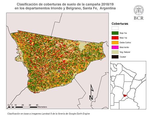 El ajuste de área se realizó utilizando la herramienta Google Earth Engine, una plataforma on line de código abierto para la visualización y procesamiento de imágenes satelitales. El equipo de GEA realizó el relevamiento en el centro- sur de Santa Fe en los departamentos de Iriondo, Belgrano y General López. En esta zona de estudio se analizó un conjunto de imágenes de los satélites Landsat 8 y Sentinel-2 en diferentes fechas, coincidentes con el periodo crítico para cada cultivo: trigo, maíz y soja. Así se llegó a una clasificación de cobertura de suelo con una precisión global cercana al 90%. Los resultados obtenidos muestran una clara tendencia en el crecimiento del área del doble cultivo y el maíz y una menor superficie sembrada de soja de primera.