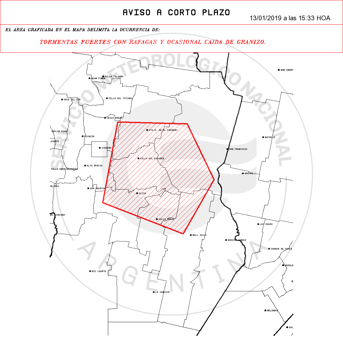 POR OCURRENCIA DE: TORMENTAS FUERTES CON RAFAGAS Y OCASIONAL CAIDA DE GRANIZO.