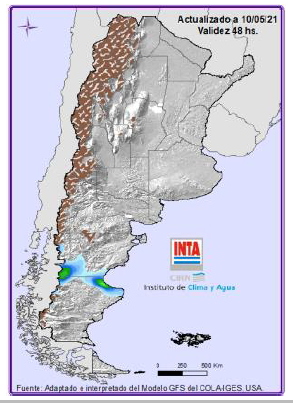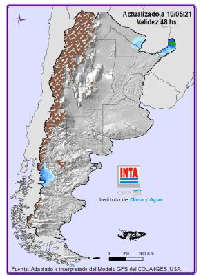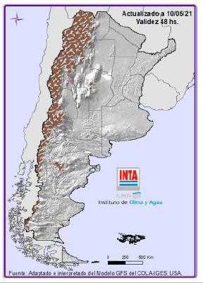 Precipitaciones: No se prevén lluvias sobre gran parte del territorio a excepción del noreste y áreas de Patagonia. Temperaturas: Hay probabilidad de ocurrencia de temperaturas mínimas inferiores a 5º sobre las regiones Cu-yo (sur), Patagonia y Pampeana (sur). Para más información local consultar: http://siga.inta.gob.ar/#/forecast