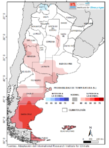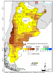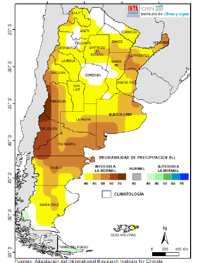 La última previsión trimestral del International Research Institute (IRI) estima, con un 40-60% de probabilidad, la ocurrencia de precipitaciones inferiores a las normales en todo el territorio nacional, con una intensidad mayor sobre Cuyo (oeste), Patagonia (norte) y áreas del NEA, según este pronóstico (Fig. 05).