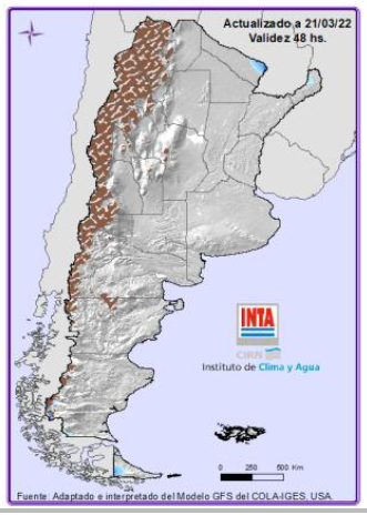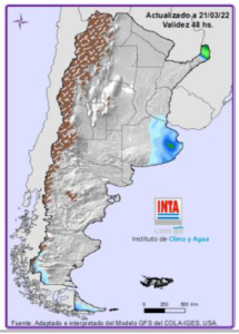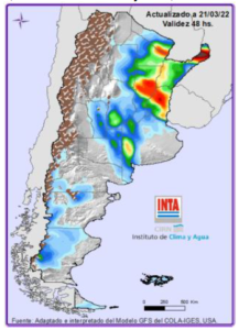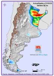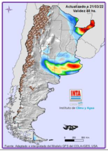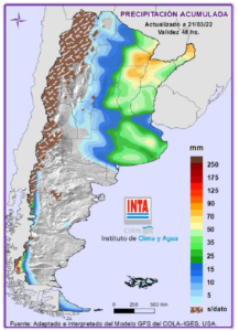 Precipitaciones: Lluvias y tormentas de variada intensidad sobre áreas del NEA y región Pampeana entre el martes y el viernes. Temperaturas: Se esperan temperaturas mínimas inferiores a 5°C sobre Patagonia y áreas de región Pampeana (oeste y sur). Para más información local consultar: http://siga.inta.gob.ar/#/forecast