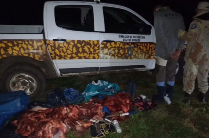 En el lugar también se halló una mochila con cuchillos de faena con restos de sangre, un teléfono celular, ganchos, cuchillos, cuatro cartuchos de fusil y el animal carneado, una vaca de 400 kilos, con marca de su propietario.