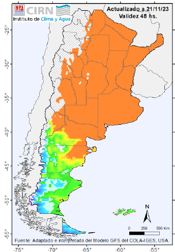 De este modo, las precipitaciones serían superiores a los normales sobre la reg. Pampeana (norte), áreas del NEA, el NOA (sur), Cuyo, La Pampa, Santa Cruz y Tierra del Fuego.