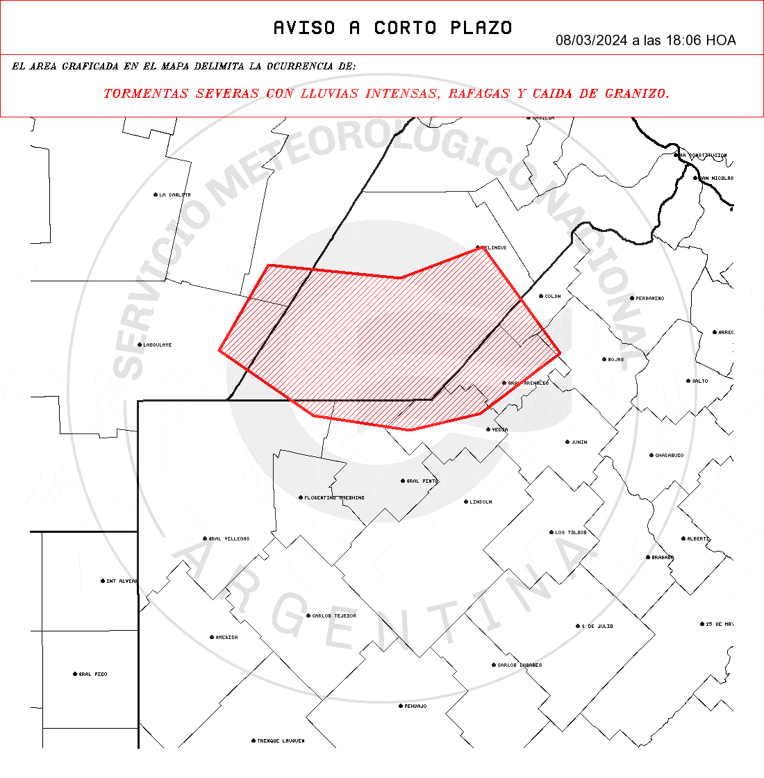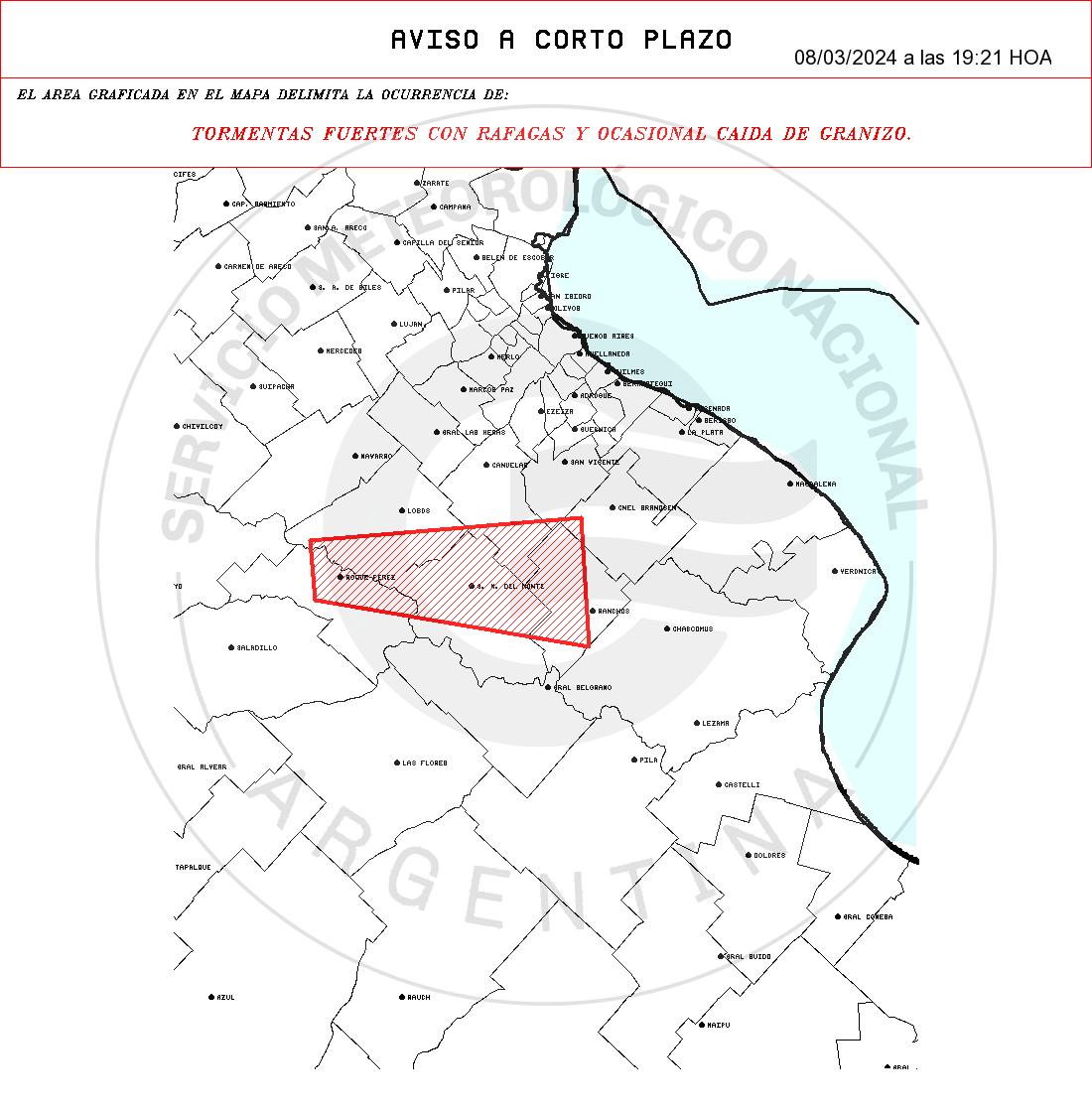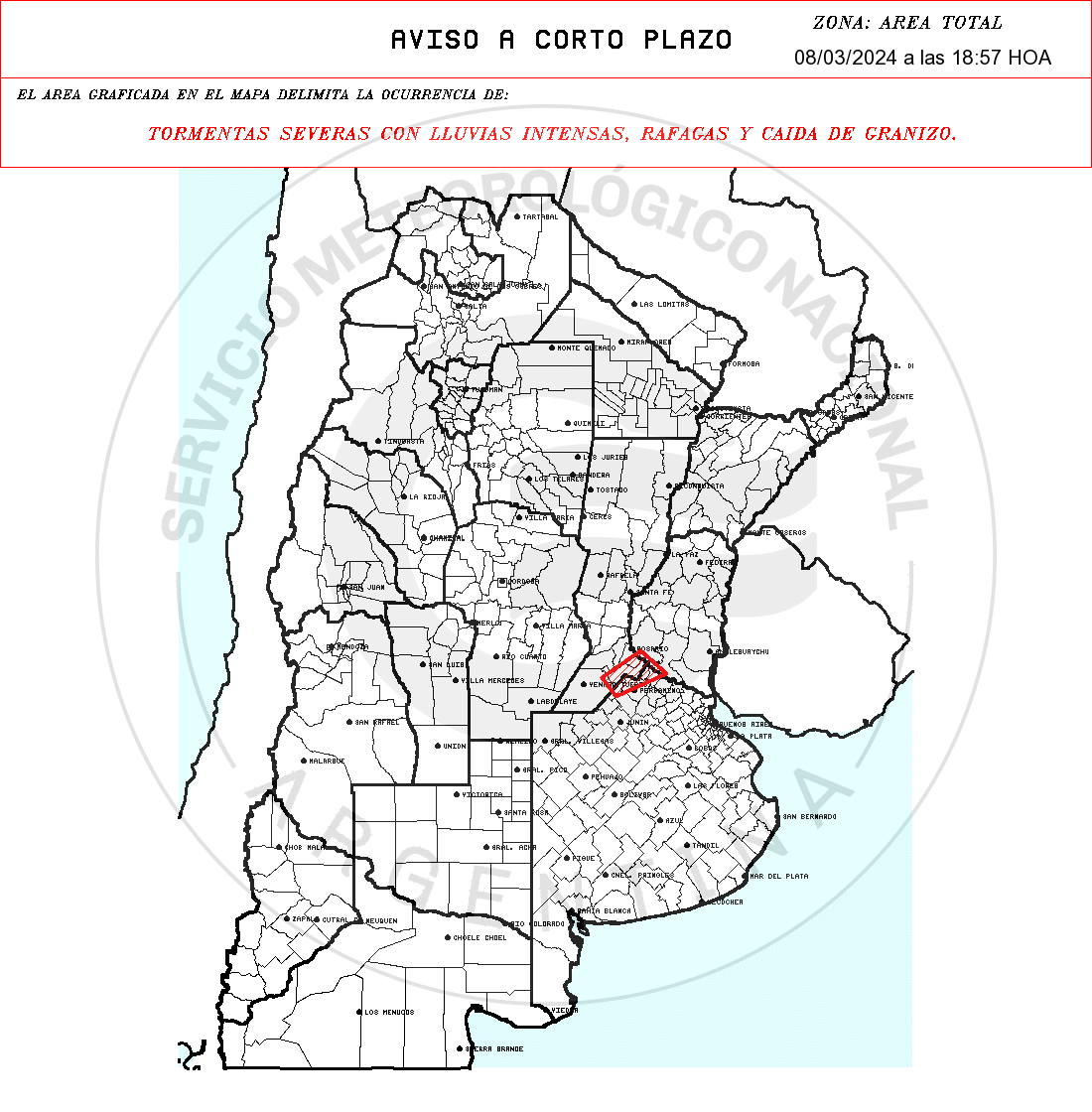 - Medidas de protección: 1- Asegurá los objetos que puedan ser arrojados por el viento. 2- Mantenete alejado de los árboles, ya que la fuerza del viento podria quebrar alguna de sus ramas. 3- Permanecé en construcciones cerradas como casas, escuelas o edificios públicos. 4- Mantenete alejado de artefactos eléctricos y evitá el uso de teléfonos con cable. 5- Evitá actividades al aire libre. 6- Para minimizar el riesgo de ser alcanzado por un rayo, no permanezcas en playas, ríos, lagunas o piletas.Los fenómenos indicados en el ACP fueron detectados con radares meteorológicos.