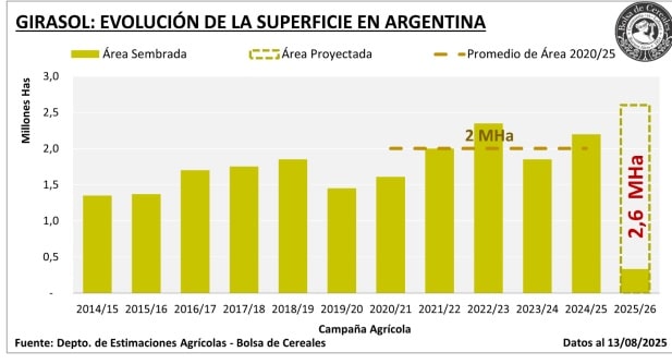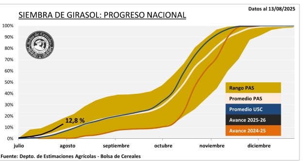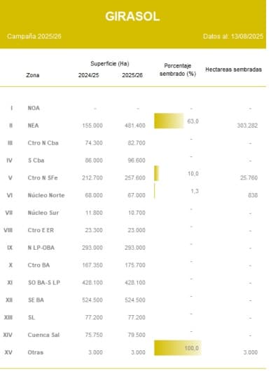 La siembra de girasol en Argentina cubre ya el 12,8% del área proyectada para la campaña 2025/26, según el último informe.