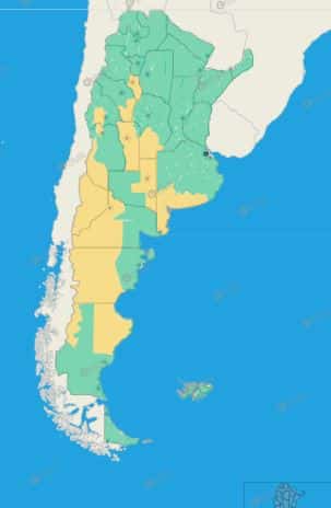Buenos Aires: Costa de Lobería – Costa de Necochea – Costa de San Cayetano – Costa de Tres Arroyos – Adolfo Gonzales Chaves – Centro de Lobería – Norte de Coronel Dorrego – Norte de Necochea – Norte de San Cayetano – Norte de Tres Arroyos – Norte de Bahía Blanca – Oeste de Patagones – Oeste de Villarino – Puan – Zona baja de Coronel Pringles – Zona baja de Coronel Suárez – Zona baja de Saavedra – Zona baja de Tornquist – Norte de Bahía Blanca – Oeste de Patagones – Oeste de Villarino – Puan – Zona baja de Coronel Pringles – Zona baja de Coronel Suárez – Zona baja de Saavedra – Zona baja de Tornquist – Costa de Patagones