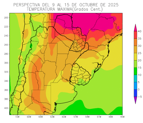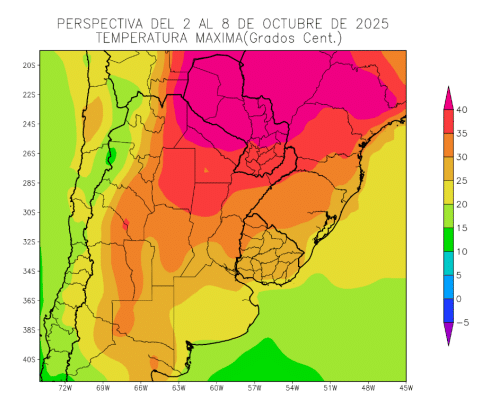 Pese al retorno de los vientos del Trópico durante los días precedentes, la perspectiva comenzará con temperaturas algo bajo lo normal, pero muy pronto se alcanzarán marcas elevadas en la mayor parte del área agrícola, con focos de calor intenso sobre el norte, y registros elevados, pero no extremos sobre el centro y el sur, mientras el Litoral Atlántico observará valores algo inferiores a la media.