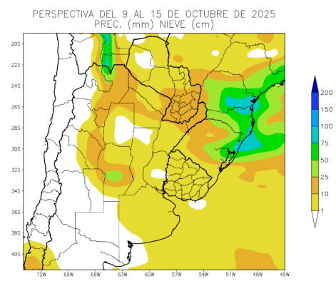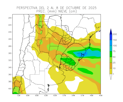 Hacia mediados de la perspectiva, se producirá el paso de un frente con actividad muy diferencial, produciendo precipitaciones de variada intensidad, con registros moderados a abundantes sobre el norte y el centro-este de La Argentina y la mayor parte del Uruguay, pero dejando a la mayor parte del Paraguay y a la mayor parte del oeste y todo el sur de La Argentina con aportes escasos a nulos, mientras la Cordillera Sur observará algunas tormentas tardías.