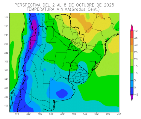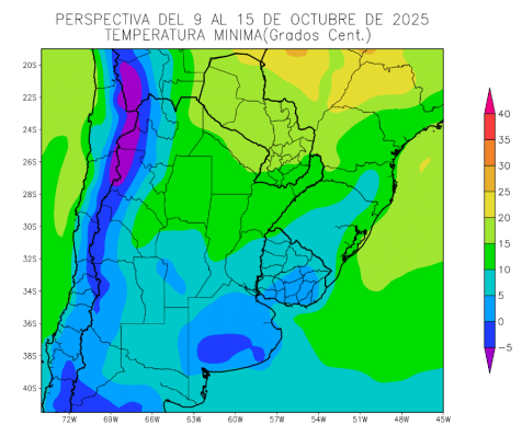 Junto con el paso del frente, se producirá una vigorosa irrupción de los vientos del sur, produciendo un marcado descenso térmico, con temperaturas mínimas bajo lo normal en la mayor parte del área agrícola, con riesgo de heladas generales sobre las zonas serranas y cordilleranas del oeste y las serranías bonaerenses. • Sólo el nordeste del NOA, la Región del Chaco, la mayor parte del Paraguay, gran parte de la Mesopotamia, el norte de la Región Pampeana y el extremo noroeste del Uruguay observarán temperaturas mínimas superiores a 10°C con registros superiores hacia el Norte.