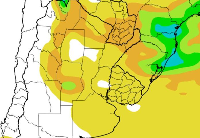 • La mayor parte del área agrícola del Cono sur registrará precipitaciones escasas a nulas (menos de 10 mm), con algunos focos aislados de valores moderados.