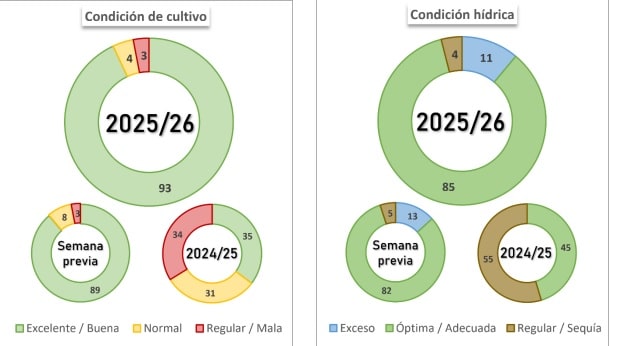 Las labores de protección continúan a buen ritmo, con aplicaciones de fitosanitarios destinadas a controlar enfermedades fúngicas y plagas, lo que permite sostener el potencial productivo. En este marco, los rendimientos estimados siguen ajustándose al alza, con valores que se aproximan a los máximos históricos.