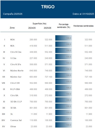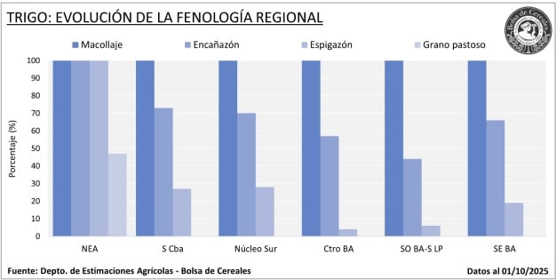 El trigo atraviesa una etapa decisiva con un panorama alentador. Las lluvias recientes llegaron en el momento justo y, aunque no se habían reportado lotes con falta de humedad, el aporte hídrico resulta fundamental en un contexto de temperaturas en ascenso, especialmente cuando el 80% del cereal ya transita desde encañazón en adelante.
