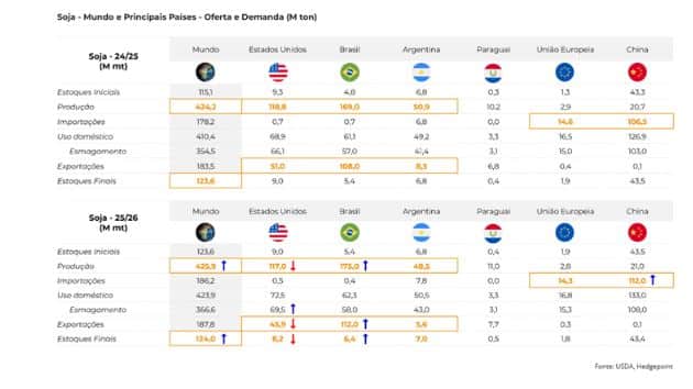- Cosecha 2025/26: la proyección inicial de Hedgepoint apunta a una producción de 178 M de toneladas, lo que podría representar un nuevo récord. La atención se centra en los posibles efectos de La Niña en el sur del país.