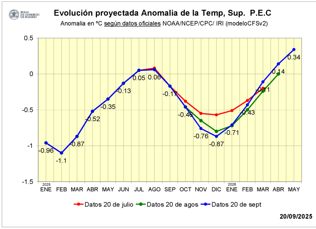 Los modelos proyectan que el enfriamiento continuará de manera moderada, alcanzando –0,76 °C en noviembre y –0,87 °C en diciembre.