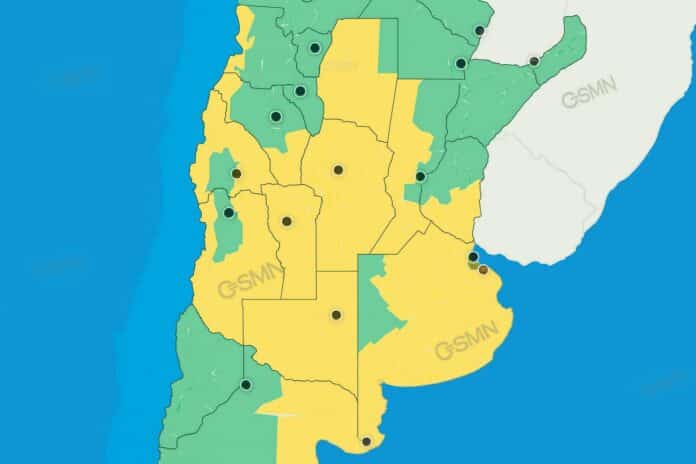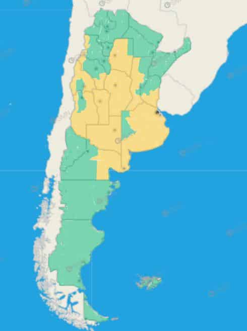 Buenos Aires: Almirante Brown – Avellaneda – Berazategui – Florencio Varela – Lanús – Lomas de Zamora – Presidente Perón – Quilmes – Escobar – San Fernando – San Isidro – Tigre – Vicente López – Campana – Exaltación de la Cruz – San Antonio de Areco – Zárate – Baradero – Ramallo – San Nicolás – San Pedro – Arrecifes – Capitán Sarmiento – Carmen de Areco – Chacabuco – Colón – General Arenales – General Pinto – Junín – Leandro N. Alem – Lincoln – Pergamino – Rojas – Salto – Esteban Echeverría – Ezeiza – La Matanza – Merlo – General Las Heras – General Rodríguez – Luján – Marcos Paz – Mercedes – San Andrés de Giles – Suipacha – Bolívar – Carlos Casares – Carlos Tejedor – Hipólito Yrigoyen – Pehuajó – Alberti – Bragado – Chivilcoy – General Viamonte – Nueve de Julio – Veinticinco de Mayo – Brandsen – Cañuelas – Oeste de Magdalena – San Vicente – Berisso – Ensenada – La Plata – Este de Castelli – Este de Chascomús – Este de Dolores – Este de Lezama – Este de Magdalena – Este de Punta Indio – Este de Tordillo – Oeste de Castelli – Oeste de Chascomús – Oeste de Dolores – Oeste de General Lavalle – Oeste de Lezama – Oeste de Punta Indio – Oeste de Tordillo – Pila -General Alvear – General Belgrano – General Paz – Las Flores – Lobos – Monte – Navarro – Roque Pérez – Saladillo – Azul – Rauch – Tapalqué – Zona baja de Benito Juárez – Zona baja de Tandil -Zona serrana de Benito Juárez – Zona serrana de Lobería – Zona serrana de Necochea – Zona serrana de Tandil – General La Madrid – Laprida – Olavarría – Norte de Bahía Blanca – Oeste de Patagones – Oeste de Villarino – Puan – Zona baja de Coronel Pringles – Zona baja de Coronel Suárez – Zona baja de Saavedra – Zona baja de Tornquist – Costa de Bahía Blanca – Costa de Coronel Dorrego – Costa de Coronel de Marina Leonardo Rosales – Costa de Villarino – Monte Hermoso -Ayacucho – Balcarce – General Guido – Maipú – Noroeste de General Juan Madariaga – Noroeste de Mar Chiquita – Oeste de General Pueyrredón – Costa de General Pueyrredón – Costa de Mar Chiquita – General Alvarado – Costa de Lobería – Costa de Necochea – Costa de San Cayetano – Costa de Tres Arroyos – Pinamar – Sudeste de General Juan Madariaga – Villa Gesell
