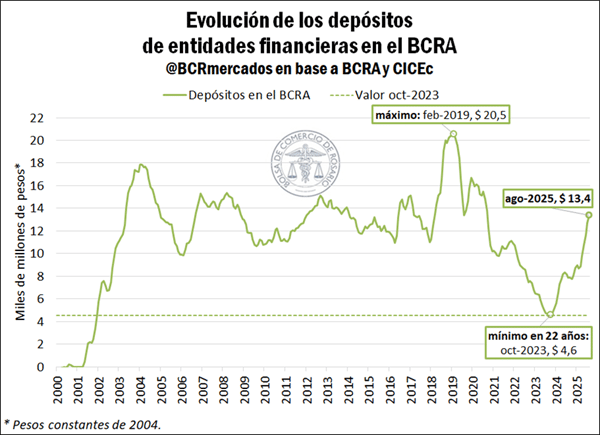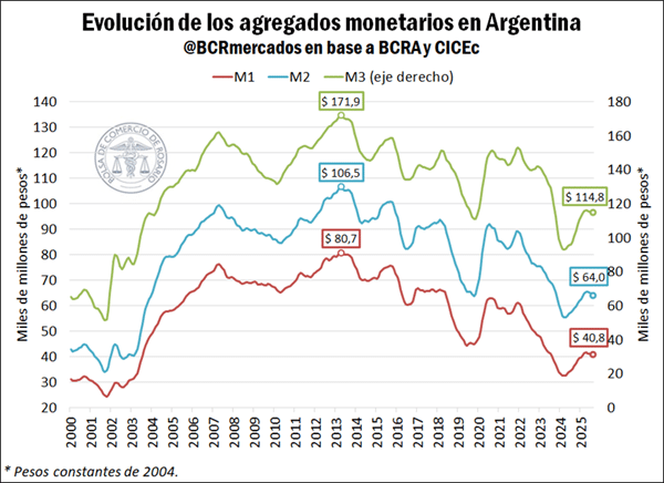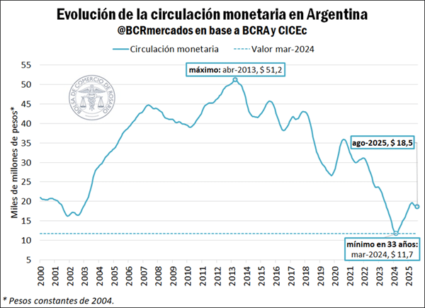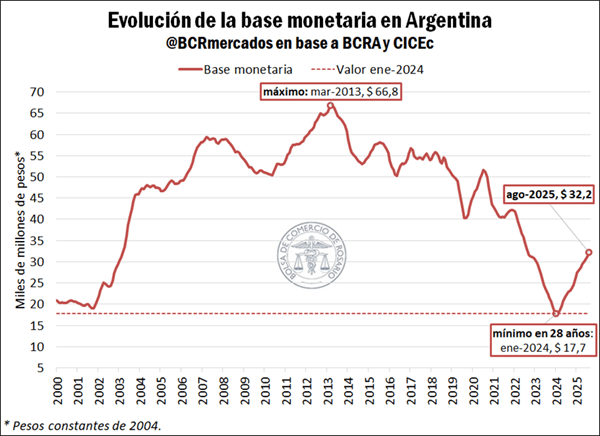 En enero de 2024 la base monetaria se ubicó en mínimos no vistos desde 1996, reflejo de una economía golpeada por la inflación y la pérdida de confianza en el peso. Sin embargo, a partir de febrero comenzó una tendencia alcista que se mantuvo hasta agosto de 2025. Aun así, el nivel actual continúa 52% por debajo del máximo de marzo de 2013 y en valores comparables a los del año 2003.