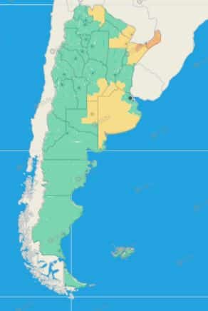 Buenos Aires: Baradero – Ramallo – San Nicolás – San Pedro – Arrecifes – Capitán Sarmiento – Carmen de Areco – Chacabuco – Colón – General Arenales – General Pinto – Junín – Leandro N. Alem – Lincoln – Pergamino – Rojas – Salto – Florentino Ameghino – General Villegas – Rivadavia – Alberti – Bragado – Chivilcoy – General Viamonte – Nueve de Julio – Veinticinco de Mayo – General Alvear – General Belgrano – General Paz – Las Flores – Lobos – Monte – Navarro – Roque Pérez – Saladillo – Adolfo Alsina – Daireaux – Guaminí – Pellegrini – Salliqueló – Trenque Lauquen – Tres Lomas – Bolívar – Carlos Casares – Carlos Tejedor – Hipólito Yrigoyen – Pehuajó – General La Madrid – Laprida – Olavarría – Zona serrana de Benito Juárez – Zona serrana de Loberia – Zona serrana de Necochea – Zona serrana de Tandil – Azul – Rauch – Tapalqué – Zona baja de Benito Juárez – Zona baja de Tandil – Zona serrana de Benito Juárez – Zona serrana de Loberia – Zona serrana de Necochea – Zona serrana de Tandil – Costa de Lobería – Costa de Necochea – Costa de San Cayetano – Costa de Tres Arroyos – Adolfo Gonzales Chaves – Centro de Lobería – Norte de Coronel Dorrego – Norte de Necochea – Norte de San Cayetano – Norte de Tres Arroyos -Costa de Bahía Blanca – Costa de Coronel Dorrego – Costa de Coronel de Marina Leonardo Rosales – Costa de Villarino – Monte Hermoso – Norte de Bahía Blanca – Oeste de Patagones – Oeste de Villarino – Puan – Zona baja de Coronel Pringles – Zona baja de Coronel Suárez – Zona baja de Saavedra – Zona baja de Tornquist – General Alvear – General Belgrano – General Paz – Las Flores – Lobos – Monte – Navarro – Roque Pérez – Saladillo – Alberti – Bragado – Chivilcoy – General Viamonte – Nueve de Julio – Veinticinco de Mayo
