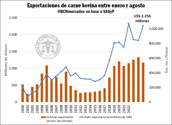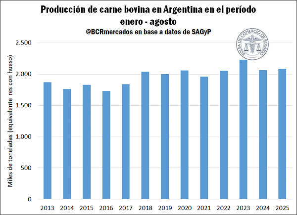 Entre enero y agosto, la producción de carne vacuna alcanzó 2,1 millones de toneladas, el segundo nivel más alto desde 2010. La faena de 9 millones de cabezas y un peso promedio de 231 kg por res reflejan una leve mejora de productividad respecto al promedio de los últimos cinco años. A pesar de que las exportaciones disminuyeron un 12% interanual (539.000 t), los precios internacionales impulsaron los ingresos hasta US$ 2.256 millones, un 24% más que en 2024. El consumo interno también se recupera, con 1,6 millones de toneladas, un aumento del 7% frente al año anterior.
