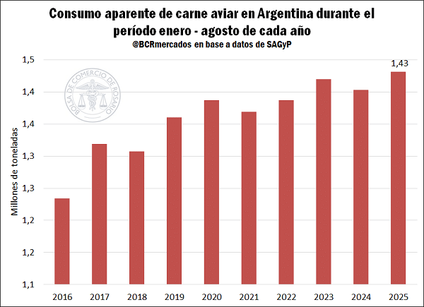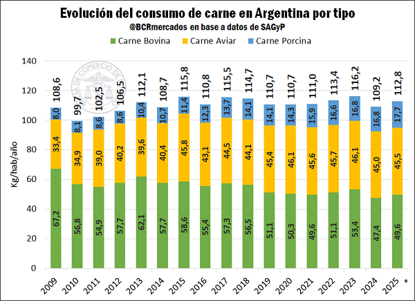 Con la recuperación de las tres proteínas, el consumo per cápita en 2025 se estima en 49,6 kg de carne vacuna, 45,5 kg de pollo y 17,7 kg de cerdo, totalizando 113 kg por habitante, un crecimiento del 3% respecto al año pasado y en línea con los promedios históricos.