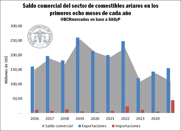 El pollo continúa su crecimiento, con 1,5 millones de toneladas producidas y un consumo récord de 1,4 millones de toneladas, el más alto en los últimos 10 años. Las exportaciones sumaron 112.000 t por US$ 155 millones, con China como principal destino. No obstante, las importaciones brasileñas aumentaron a niveles históricos, generando un superávit comercial reducido de US$ 110 millones, un 20% menos que en 2024.