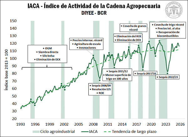 Un informe especial de la Bolsa de Comercio de Rosario reconstruyó la trayectoria del sector a través del Índice de Actividad de la Cadena Agropecuaria (IACA-BCR), herramienta que permite visualizar cómo la tecnología, el clima, los vaivenes globales y la política económica moldearon a la agroindustria desde 1993.