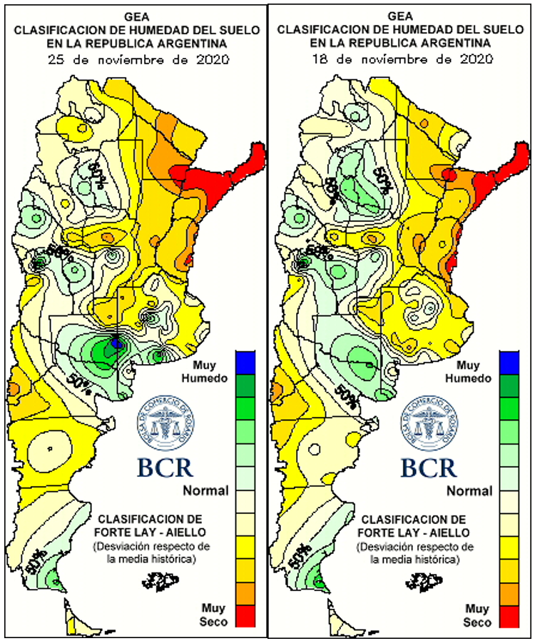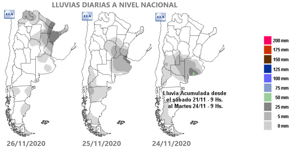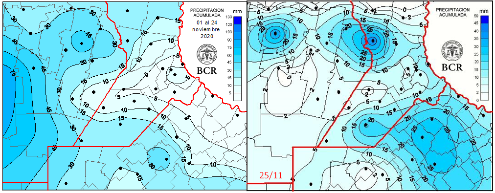 En noviembre la región núcleo suele recibir entre 100 y 120 mm. Pero en este 2020, en lo que va de noviembre, el promedio de las lluvias acumuladas en las 36 estaciones de la región es de tan solo 35 mm. O sea, llovió solo el 31% de la media mensual. Esto es una señal de mucha preocupación para el sector, aparte del golpe de calor que mantuvo a principios dela semana que marcó máximas de 36 a 43°C en la región. Al 24 de noviembre, ya transitando la cuarta semana del mes, el 20% de la región núcleo, en todo el mes, mostraba lluvias acumuladas que ni siquiera totalizaban los 10 mm. Por suerte hubo un evento de lluvias que se concretó el 25/11, el de la imagen de la derecha, algo muy positivo para la siembra de soja en el este de la región núcleo. Ese evento dejó lluvias de 20 a 30 mm en el castigado NE bonaerense. Aparte, en Montes de Oca hubo un núcleo aislado de 40 mm y en Hernando otro de 39,2 mm. Pero en el 47% del resto de la región las lluvias fueron inferiores a los 10 mm.