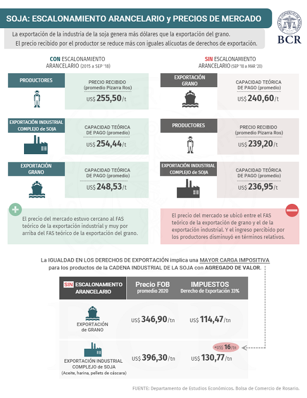 Dado el gran excedente exportable de soja en Argentina, la eliminación del escalonamiento arancelario desalienta la industrialización de la oleaginosa y disminuye el ingreso percibido por los productores agropecuarios. Con el escalonamiento arancelario existente (3 puntos) previo a septiembre de 2018, el precio del mercado estuvo cercano al FAS teórico de la exportación industrial y muy por encima de la capacidad teórica de pago de la exportación del grano de soja.