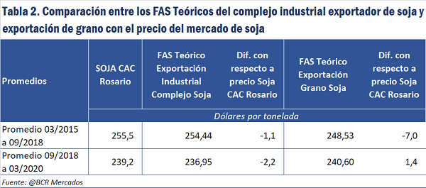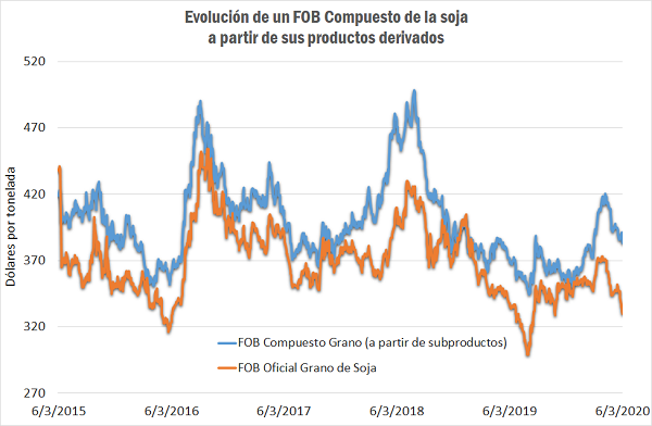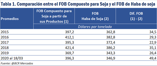 Si se compara el promedio del FOB Compuesto para el grano (US$ 398,95/t) y el promedio del FOB de soja desde el 2015 al 18 de marzo de 2020 (US$ 368,65 /t), el primero habrá superado al segundo en poco más de US$ 30 por tonelada. En la tabla N° 1, se exponen los promedios anuales y sus diferencias.