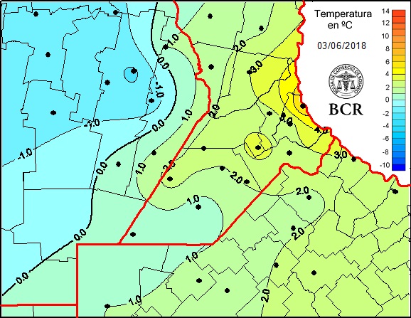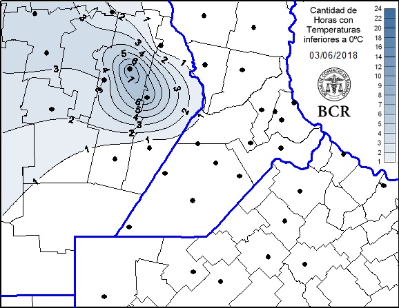 El primer domingo de junio amaneció blanco. El ingreso de aire frío y seco durante el último fin de semana provocó un feroz descenso de las marcas térmicas en toda la región núcleo. En los alrededores de Bellville los termómetros permanecieron durante más de 7 horas por debajo de cero grado. Fue el centro neurálgico de las heladas, por la baja registrada y la cantidad de horas que duró el evento. Muy cerca de allí, en Monte Buey las temperaturas bajo cero se mantuvieron un poco más de seis horas.