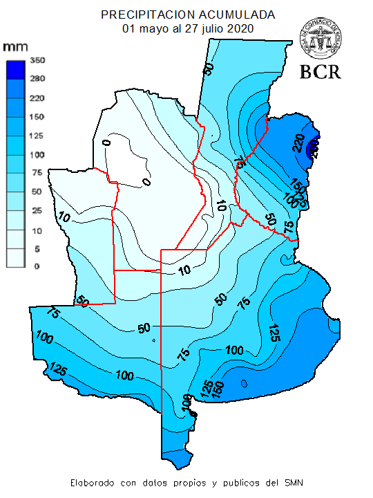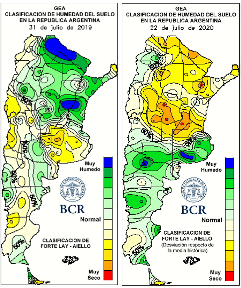 Hoy, a fines de julio del 2020, Córdoba cumple 90 días sin recibir agua con 65 mil ha de trigo en malas condiciones y 200 mil ha en condiciones regulares. Y no es la única zona con problemas. En Chaco y Santiago del Estero, si no llueve en 25 días, gran parte de los lotes sembrados pueden perderse. En el sur de Santa Fe, aún con reservas de humedad en las capas profundas del suelo, si no llueve de forma importante en 20 días, los rindes van a caer en picada, adviertan los técnicos. Más allá de la buena situación hídrica que atraviesan Buenos Aires, La Pampa y Entre Ríos y Norte de Santa Fe, la situación es muy delicada en la franja central y en el norte de Argentina. Ya hay varios focos de sequía extrema en Córdoba y uno en el sur de Santa Fe. Estos focos indican que se alcanzó la condición más seca respecto a la media histórica de los últimos 30 años para esta época del año.