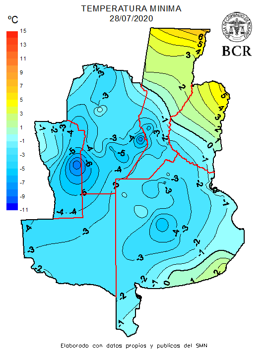 El buen tiempo, frío y seco, acompañará los últimos días de julio y los primeros de agosto. Se está desarrollando un nuevo pulso frío que llevó las mínimas de 10 a 15 grados, en los recientes días, a mínimas de 5 grados bajo cero como se registró hoy en el sur de Córdoba. El frío continuará en los próximos días y se espera que los registros sean más bajos mañana, miércoles 29 de julio.