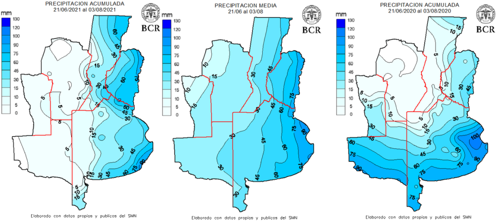 Regular a mal, el comportamiento está bastante por debajo de lo que se esperaba hasta hace un par de meses. Las lluvias de la primera mitad del invierno de este año están muy por debajo de los acumulados medios históricos de los últimos treinta años, tal como pasaba en el 2020. Las diferencias se ven en Buenos Aires y La Pampa que, a pesar de la influencia del evento Niña, a esta altura del invierno del 2020 no solo alcanzaban sino que superaban los valores medios estadísticos del periodo.