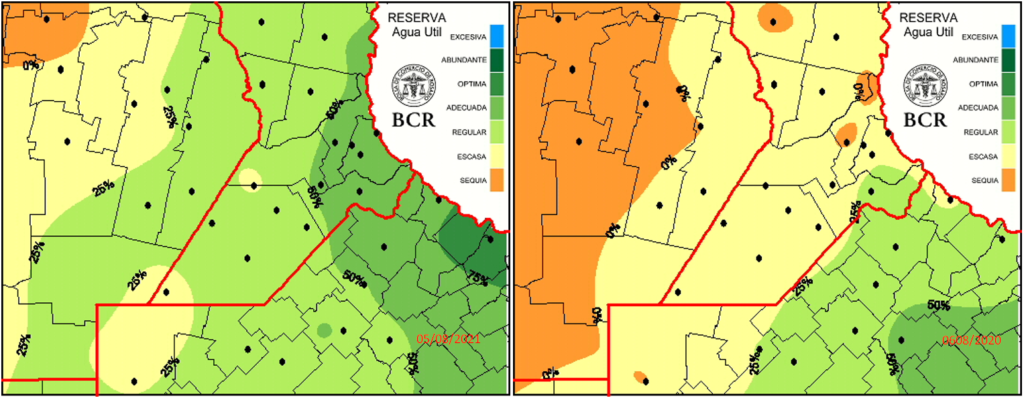 Otra semana sin lluvias aumenta la preocupación por el descenso de las reservas de agua en trigo. Ya se evidencian los primeros lotes en condición regular. Son 50 mil ha ubicadas en el centro-sur santafesino que necesitan lluvias en los próximos días para no seguir bajando la condición. Pero en comparación con lo que sucedía un año atrás, el 2021 sigue siendo favorable: en agosto del 2020 una ola de calor aceleró la desecación del suelo y se contabilizaban casi medio millón de ha de regulares a malas condiciones. Actualmente, el 42% del trigo se clasifica en muy buenas condiciones y el 55%, en buenas.