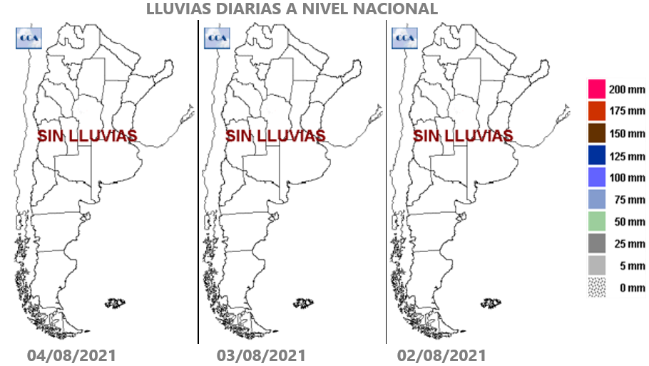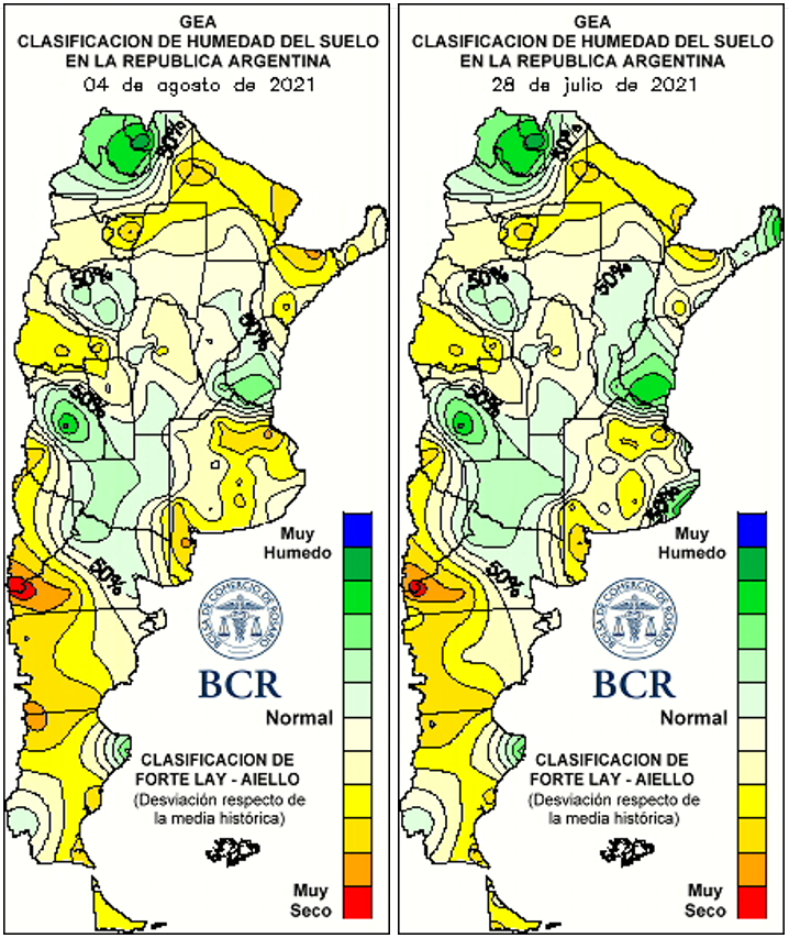 El centro-sur santafesino y el departamento Unión en Córdoba muestran la mayor pérdida de humedad. En Carlos Pellegrini, los primeros lotes sembrados están agotando la poca humedad que queda en los primeros niveles del suelo, por lo que debería llover en la semana próxima para no perder macollos ni condición del cultivo. En Cañada de Gómez, también los macollos están amenazados si no llueve dentro de los próximos 10 días. En Cañada Rosquín, la humedad de suelo permite llegar al 20 de agosto sin inconvenientes. Pero a partir de esa fecha, con temperaturas más altas y con un cultivo más demandante de agua, comenzarán los problemas. Ahora, se necesitan de 10 a 20 mm que regularicen el crecimiento de los lotes más flojos. Hacia el sur provincial y en el noreste bonaerense, si bien las reservas son buenas y el trigo está macollando sin limitantes, se necesitaría una lluvia de 15 mm para mantener las buenas perspectivas de rinde. En Marcos Juárez, la reserva de humedad en el suelo todavía es importante. La lluvia en julio de 10 mm cargo la superficie del suelo. Llegando a fin de agosto o principios de septiembre se necesitaría una buena recarga. Hacia el oeste la necesidad de precipitaciones va en aumento: se necesitan de 80 a 100 mm para alcanzar niveles óptimos de humedad.