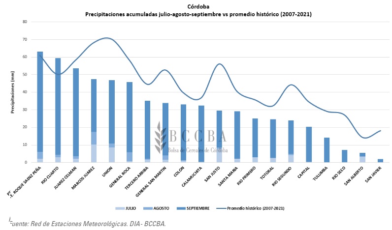 Como se puede ver en el gráfico el mayor milimetraje se acumuló en el mes de septiembre, con precipitaciones generalizadas en toda la provincia, registrándose las menores en los departamentos San Javier, San Alberto, Río Seco e Ischilín. Según reportan nuestros colaboradores al sur de la provincia las precipitaciones ocurridas durante el último mes, mejoraron el estado general de los cultivos.