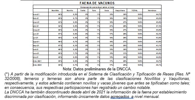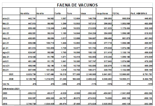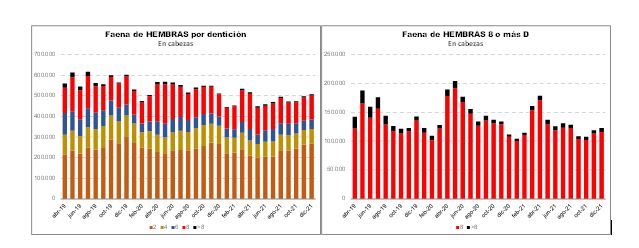 La faena de novillos tuvo una recuperación importante alcanzando en diciembre una de las cifras más elevadas del año, aunque debe resaltarse que el nivel continúa siendo bajo cuando se extiende el análisis a años anteriores. En 2019, representaban el 13 % del total y en 2021 apenas orillan el 9 %.