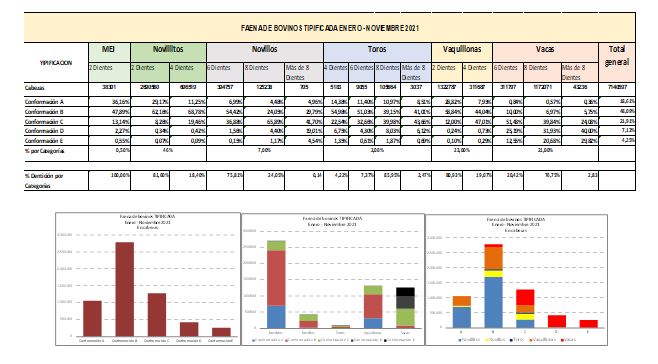 Faena tipificada: En los primeros once meses de 2021, la faena tipificada alcanzó a 7.1 millones de cabezas, el 55% del total nacional informado por la Dirección Nacional de Control Comercial Agropecuario. La faena tipificada por Conformación está desagregada por clasificación y dentición según los criterios establecidos por la Res. SAG N° 32/2018. Entre enero y noviembre, 764 mil Vacas fueron tipificadas como D y E y 123 mil cabezas como Toros.