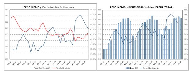 ‘’El peso medio de los bovinos faenados aumentó en el curso del año recientemente finalizado: fue de 210 kg/cabeza para las hembras y 246 kg/cabeza para los machos, en ambos casos superan los guarismos de 2020, consecuencia de una reducción en el sacrificio de hembras y de la menor presencia de animales más livianos, que se dio a comienzos de este año. El resultado de ello es un valor promedio de 228 kg/cabeza, 2 kg mayor a la media de 2020, resultado de un proceso virtuoso, indispensable para incrementar la producción nacional de carnes bovinas pero insuficiente por tratarse de índices significativamente menores a otros países proveedores del mundo. Su mejora requiere una transformación que no sólo permita el sacrificio de animales más pesados sino también un proceso genuino de recomposición de stocks que se refleje en la estructura de la oferta’’, sostiene Ravettino.