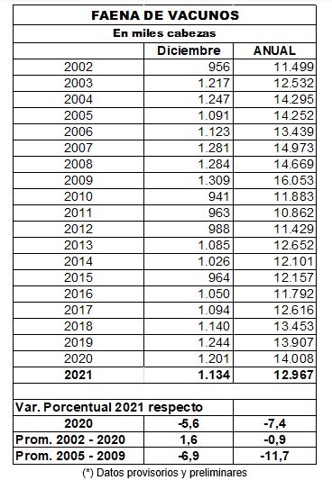 Buenos Aires, 12 de enero de 2022 – De acuerdo a datos proporcionados por la Dirección Nacional de Control Comercial Agropecuario (DNCCA), en Diciembre de 2021, la faena de bovinos alcanzó 1.13 millones de cabezas, 3 % por encima del período anterior. El año 2021 ha cerrado con una total de 12.966 miles de cabezas, una caída del 7 % comparado con el ejercicio anterior, la cifra menor desde 2017.