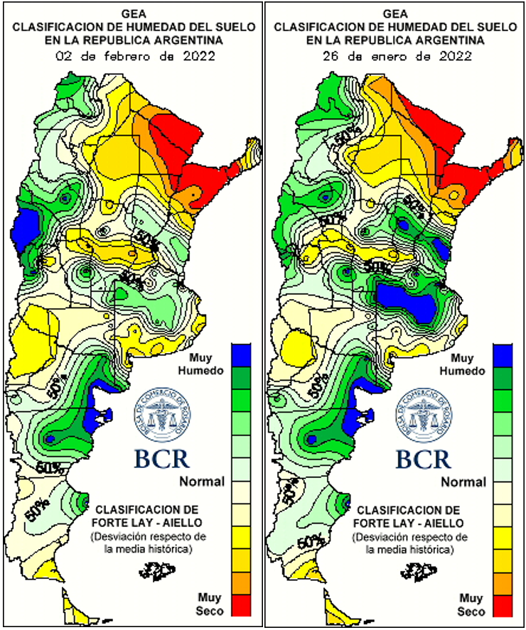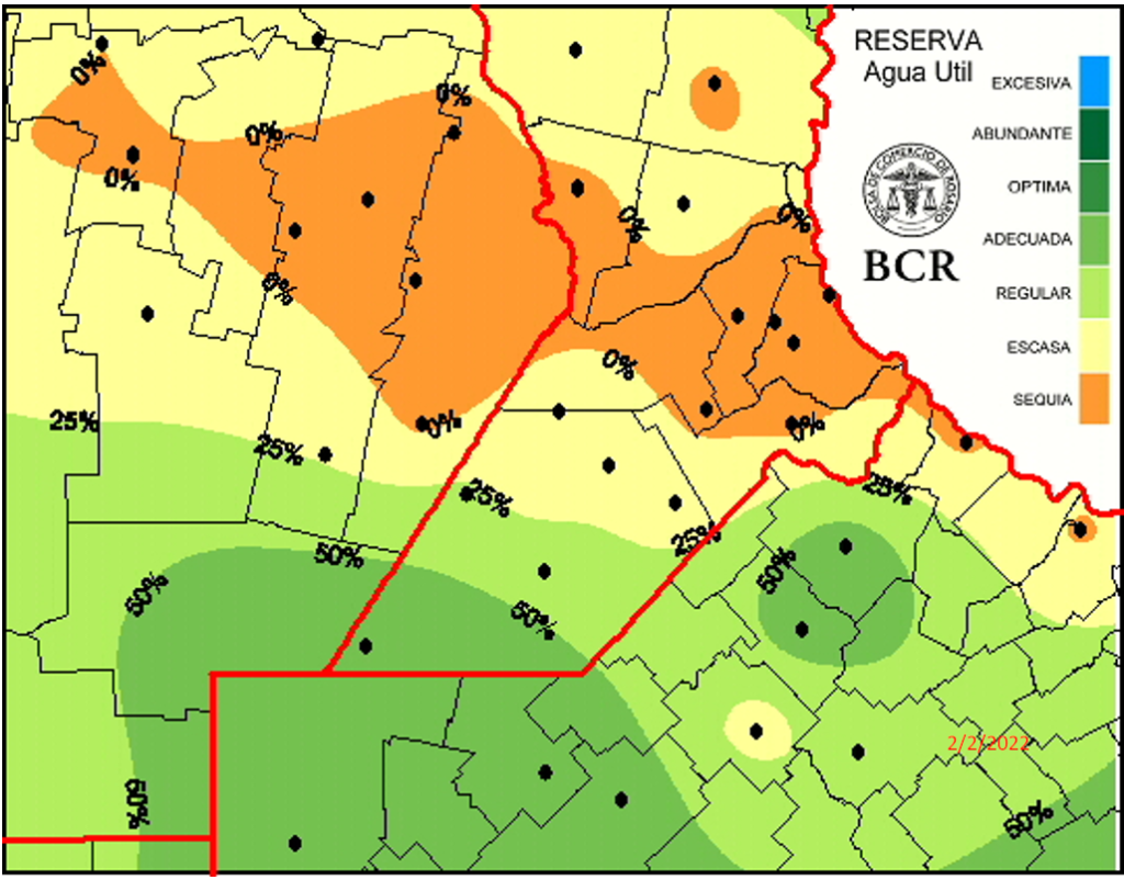 La zona de escasez y sequía avanzó en los últimos siete días del 50 al 60% justo cuando el 90% de la soja de primera entró de lleno en el período crítico en la región núcleo. No hay lluvias importantes a la vista para la segunda semana de febrero, podrían volver después de la segunda quincena.