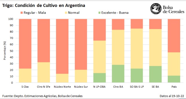 Luego de evaluar los daños generados por la helada registrada durante el fin de semana del 8 y 9 del presente mes, la producción de trigo cae a 15,2 MTn. Tras una nueva semana sin precipitaciones, el 53 % de las 6,1 MHa implantadas reportan una condición de cultivo Regular/Mala. Sectores como el Norte de La Pampa- Oeste de Buenos Aires y el Centro de Buenos Aires, donde se concentra más de un 16% de la superficie nacional del cereal de invierno, dependen de lluvias en el corto plazo que mejoren el escenario del cultivo, y amortigüen las mermas ya esperadas mientras el 19,4 % de los cuadros se encuentran en plena espigazón.