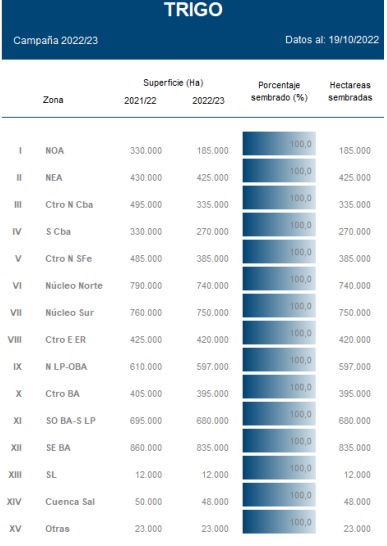 Finalmente, la falta de precipitaciones y las frecuentes heladas sobre Sudeste de Buenos Aires continúan condicionando el crecimiento del cultivo y ya se prevén mermas en los rendimientos. A la fecha, un 15 % de los cuadros se encuentra en plena espigazón. Dicha región juega un rol clave en el aporte a la producción nacional con una participación media del 15,2 % del total durante las últimas cinco campañas.